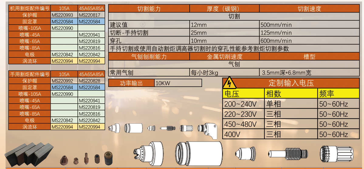 适应世界,居家在车库工作。穿孔切割模式,支持手持和机器使用通用切割。支持 220V 单相、220V/380 三相。 占空比对不同电压没 有衰减