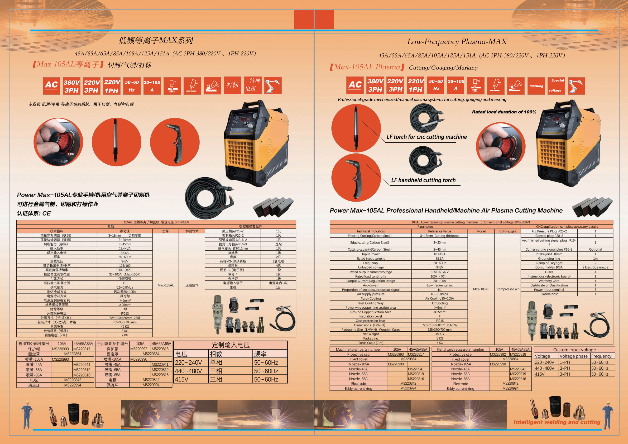 逆变式空气等离子切割机Max-105AL 单相供电220V/三相供电380V/220V Cut/Marking/Gouge 切割/打标/气刨